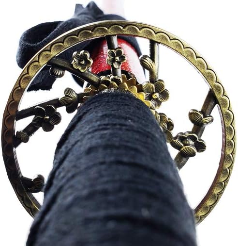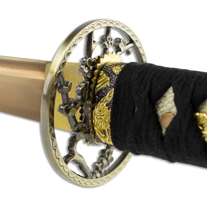 From the Musha Collection comes this intricately hand forged “Sakura”(Cherry Blossom) Katana. The Full tang Golden 1045 high carbon steel makes this a resilient katana that is razor sharp right out of the box. The detailed dual tone tsuba depicts a Sakura with matching Kashira and Fuchi.