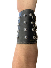 Black leather arm gauntlet featuring 20 silver rounded studs. Three adjustable buckles ensure a tight and secure fastening.