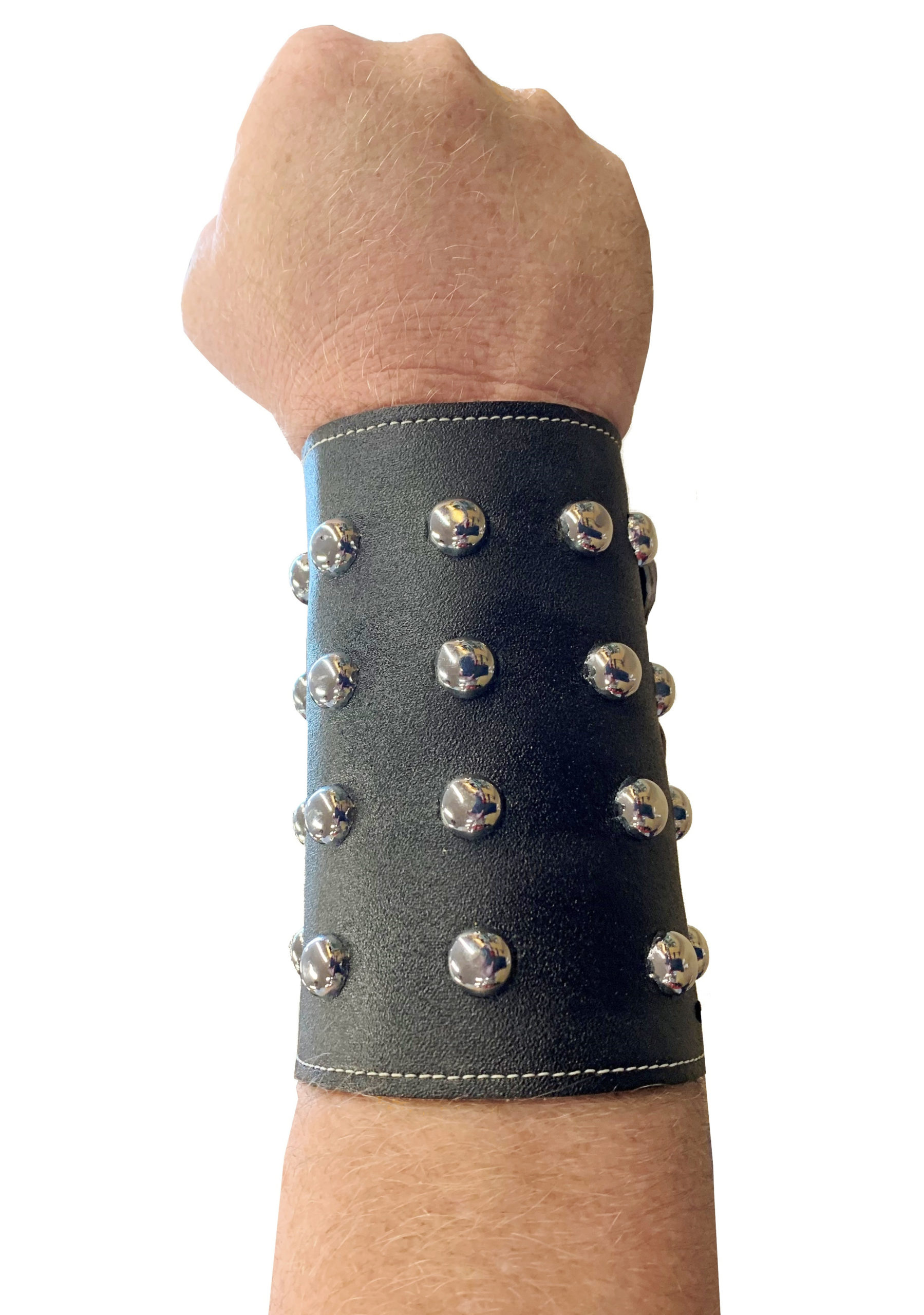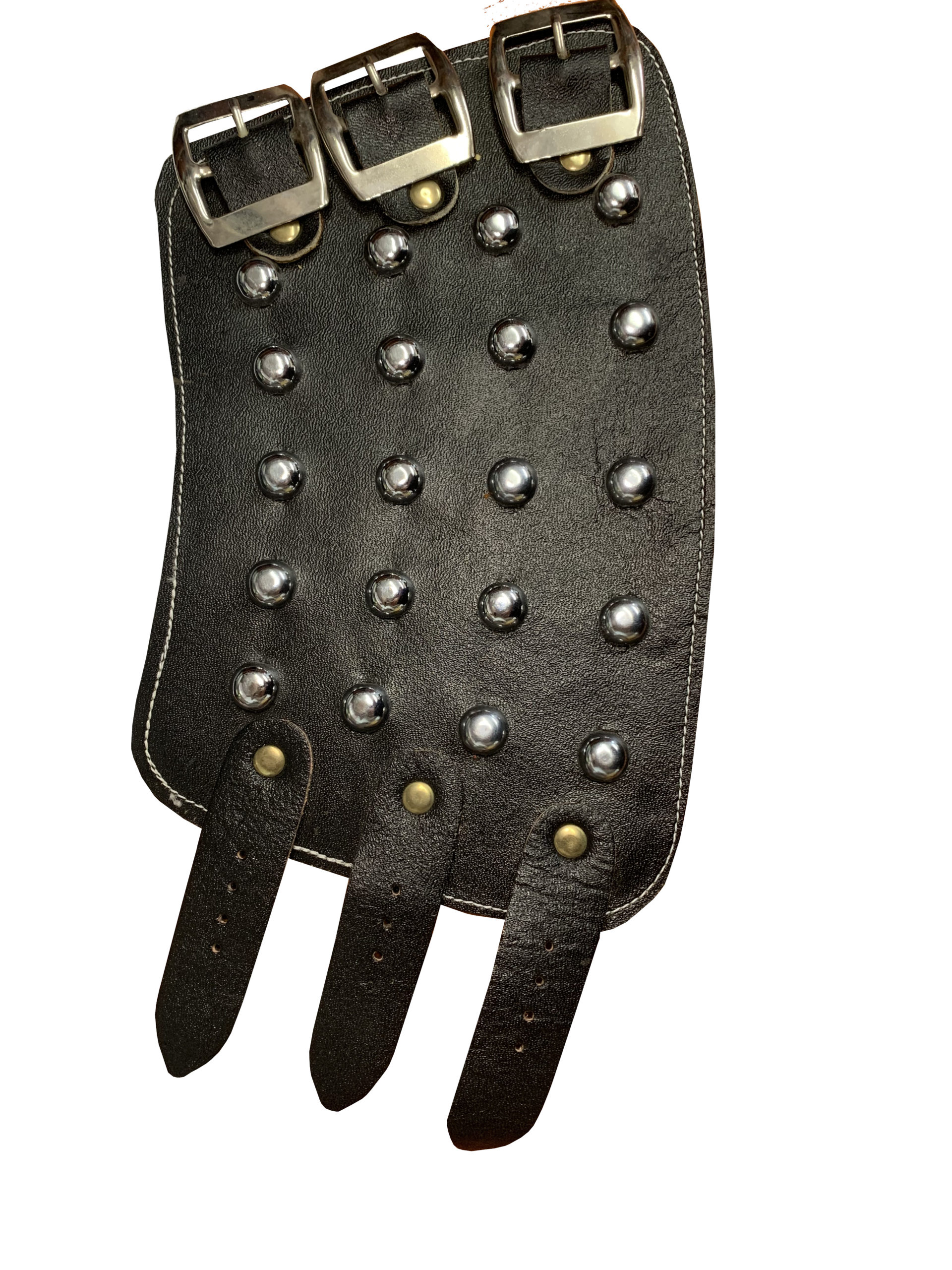 Black leather arm gauntlet featuring 20 silver rounded studs. Three adjustable buckles ensure a tight and secure fastening.