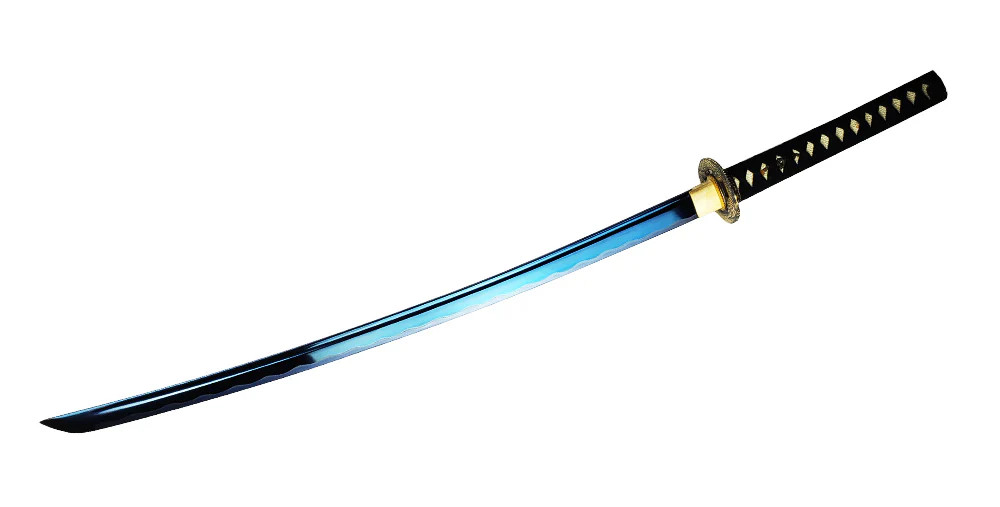 This beautiful blue blade features integrated Bo-Hi on the blade. Bo-Hi is commonly known as blood grooves, but that is a common misconception. The purpose of the Bo-Hi is to help reduce the weight of the katana, it actually has nothing to do with channeling the blood. Making the Katana lighter enables the user to wield the katana better and puts less stress on the hands. Not to mention it benefits some advance cutting techniques that requires the katana to change direction rapidly.