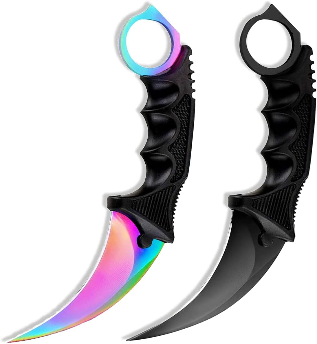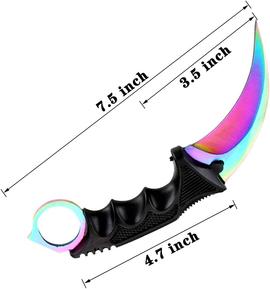 This Falcon Karambit Set showcases 1 x Black 7 1/2″ Karambit and 1 x Rainbow 7 1/2″ Karambit. Both feature 440 stainless steel blades. The handles are crafted from black ABS plastic, providing a comfortable and secure grip, while the accompanying rubber sheath ensures safe transportation and storage. An ideal addition for outdoor settings and self-defense scenarios.
