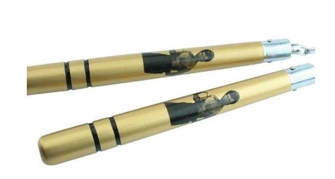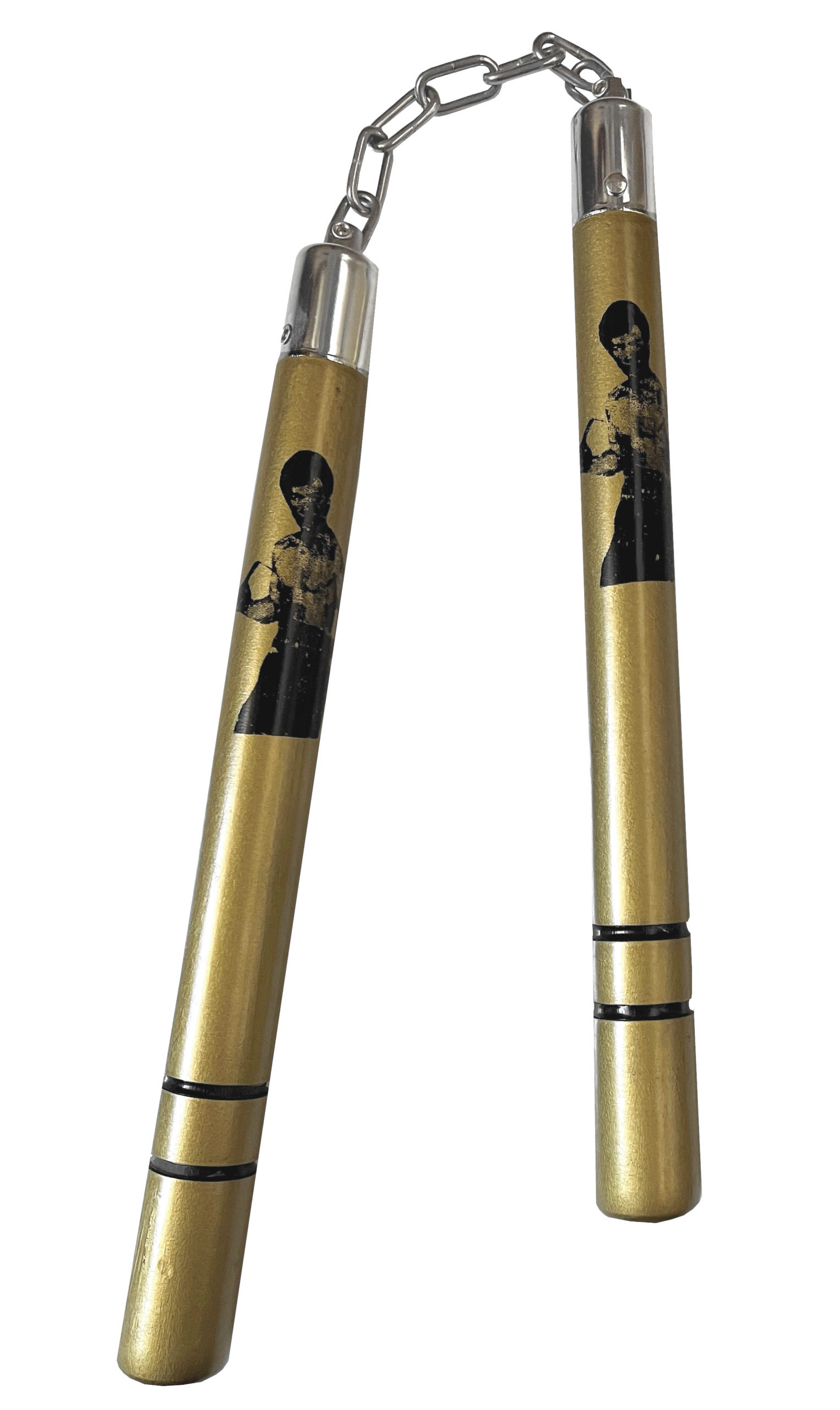 The Bruce Lee Nunchaku feature a Bruce Lee picture on each of the  12″ handles.   They feature a gold finish and two black grooves at the base for excellent grip and control.  The handles are connected with a 5″ ball bearing swivel chain, which provides free range of motion.  Nunchucks are a great tool for training as they can aid improvement with hand eye co-ordination and flexibility within the arms.