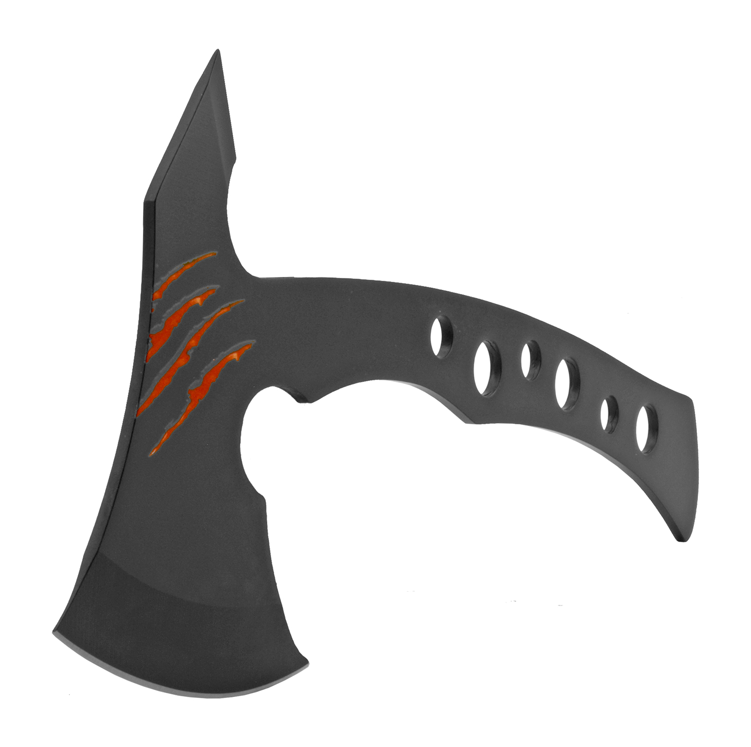 Introducing the perfect tool for an adventure: a 10″ overall length black throwing axe. Crafted with 440 stainless steel blade and a 8″ black handle, with a flashy red scar on the blade. Plus, the included nylon sleeve keeps it secure and ready for your next outdoor escapade.