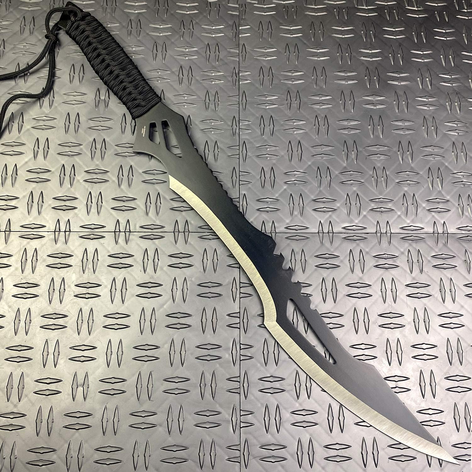 This 26″ length 440 stainless steel machete & 3 x 6.5″ throwing knife set is sure to impress! The black machete features cut outs on the blade and finished with a silver metallic blade edge. The rear of the blade has a saw back section. A nylon cord wrapped handle finishes this machete. Three kunai 6.5″ throwing knives are the perfect compliment to the machete finished in the same silver metallic edge finish and cord wrapped handles. . All three kunai and machete fit comfortably in the purpose fit heavy duty black nylon sheath with shoulder strap for ease of transport.