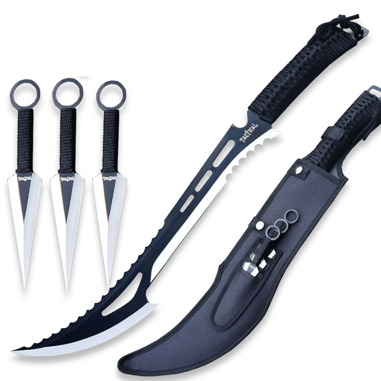 FEATURED | KNIVES | Machetes | Machetes | Ninja Swords | Samurai/Metal Swords | SHOP BY BRAND | TACTICAL MASTER | WEAPONSTactical Master 26″ Black/Silver Machete Sword with 3 Throwing Knives