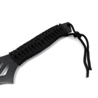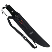 This 26″ length 440 stainless steel machete & 3 x 6.5″ throwing knife set is sure to impress! The black machete features cut outs on the blade and finished with a red metallic blade edge. The rear of the blade has a saw back section. A nylon cord wrapped handle finishes this machete. Three kunai 6.5″ throwing knives are the perfect compliment to the machete finished in the same red metallic edge finish and cord wrapped handles. . All three kunai and machete fit comfortably in the purpose fit heavy duty black nylon sheath with shoulder strap for ease of transport.