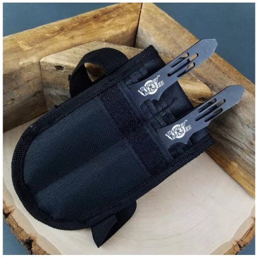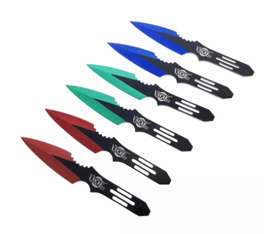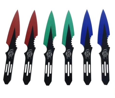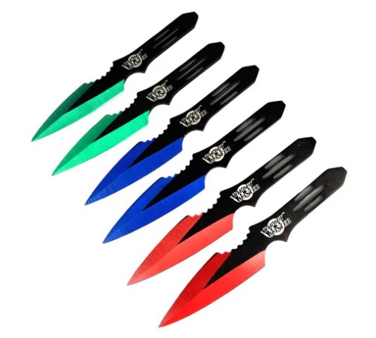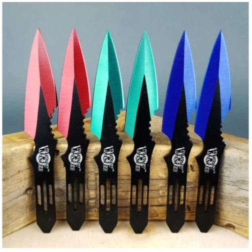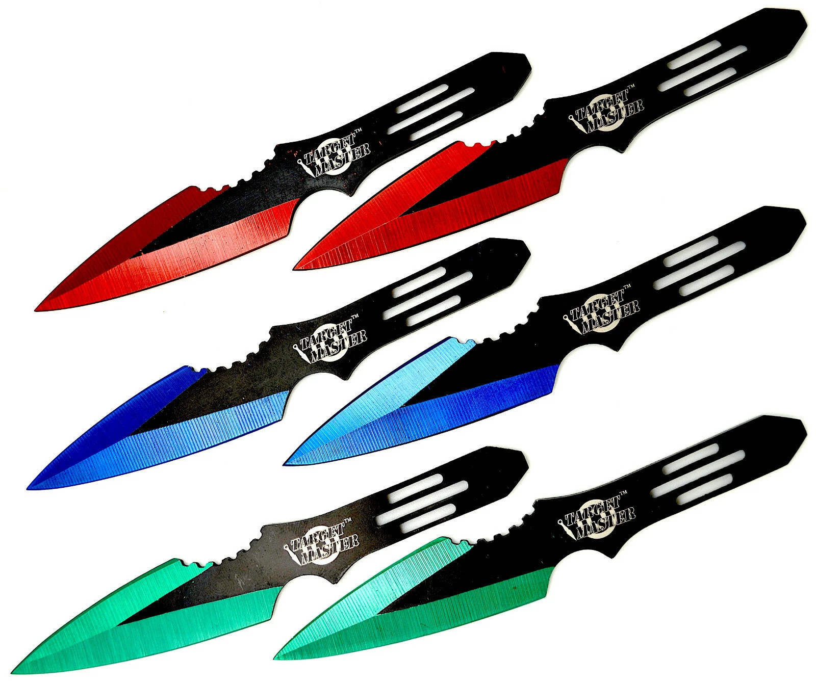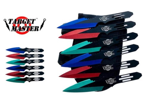 Target Master 5.5″ Overall 6 Piece Multi Color Throwing knife Set features a 2.5″ blade, 5.5″ overall length and a 6 piece metallic multi colored set with 2 blue, 2 red, and 2 green knives. The 6 Pice knife set features black vented handles and jaw blades for added stability and accuracy. Sure to impress!