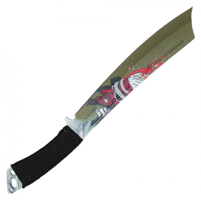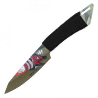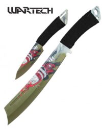 This Wartech machete and throwing knife set are sure to impress! Both the machete and throwing knife featuring a green blade with a red samurai picture on the blade. The black bound handle makes for a sure grip and control. Functional and collectable. A perfect addition to your collection!
